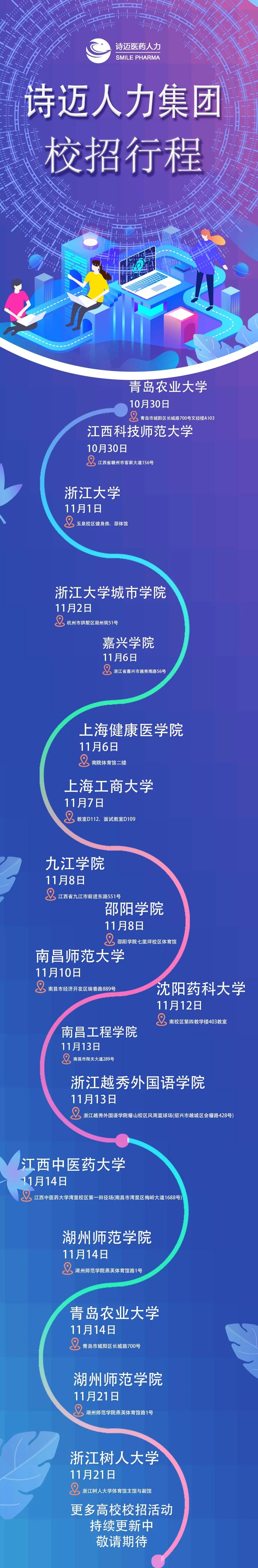 自从诗迈2021届校招开展以来,我们接收到了大量的小伙伴的简历,也有许多小伙伴在后台询问校招的时间,今天就整理部分校招行程,如果没有你的学校也不要灰心,后台告诉我们,我们就来啦!