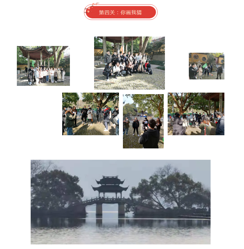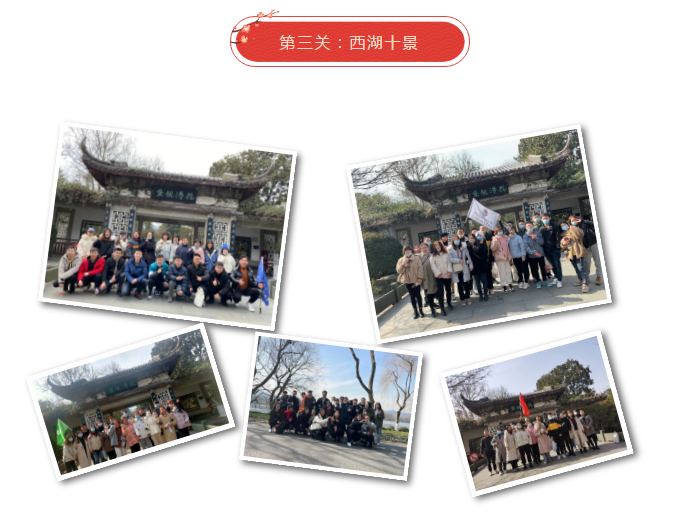 红黄紫蓝绿银,六队人马;西湖风光,五公里路程;成语接龙、跳绳接力、西湖十景、你画我猜,四道难关;体力、常识、默契三大考验;两条线路,随机选择;一个目标,勇夺冠军!