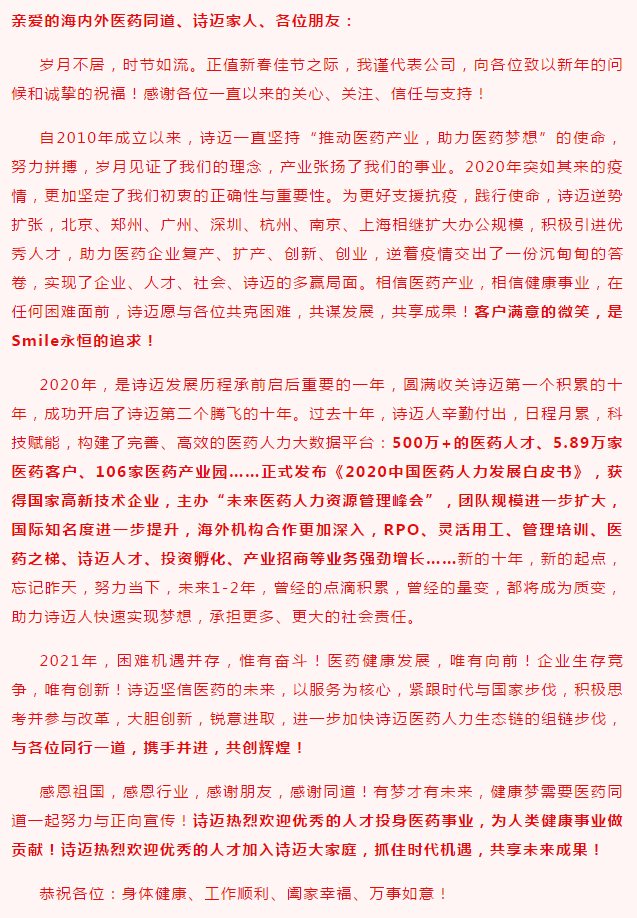 叮!您有一条新年祝福记得查收!-专业医药猎头-医药人才网杭州诗迈医药科技有限公司