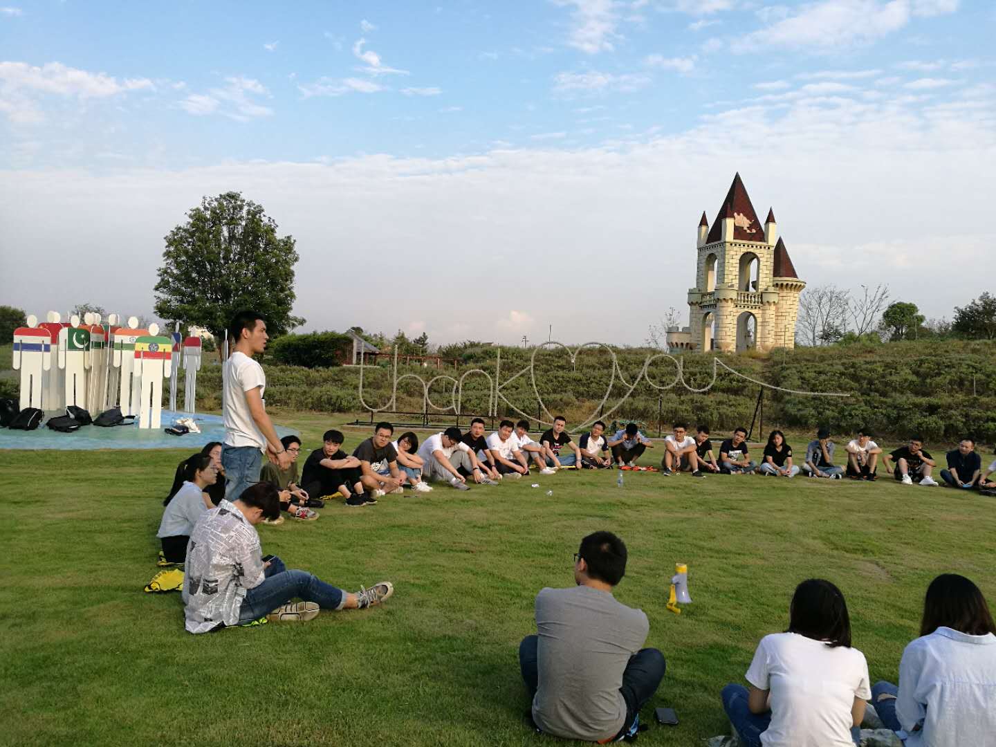 最后,落日西斜,大家开开心心的玩了整整一天,围坐在草地上,介绍着自己,认识着大家。在嘉兴留下了美好的回忆。