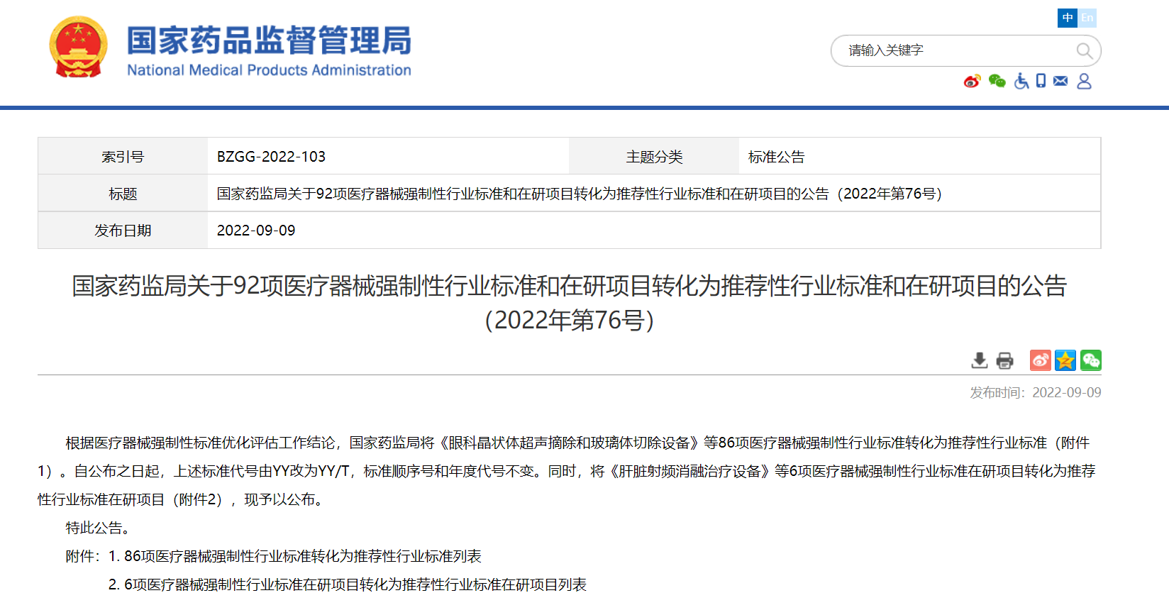 国家药监局关于92项医疗器械强制性行业标准和在研项目转化为推荐性行业标准和在研项目的公告(2022年第76号)