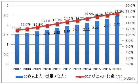 截至2016年底,中国60岁以上人口接近2.3亿,占总人口的1/6(如图1)。专家预测,2016-2020年,中国60岁及以上老年人口平均每年增加约640万,到2020年将达到2.48亿左右,约占总人口的17.2%。