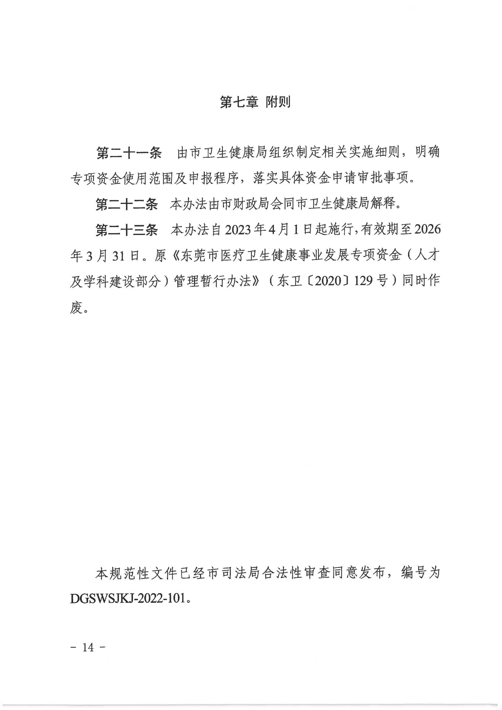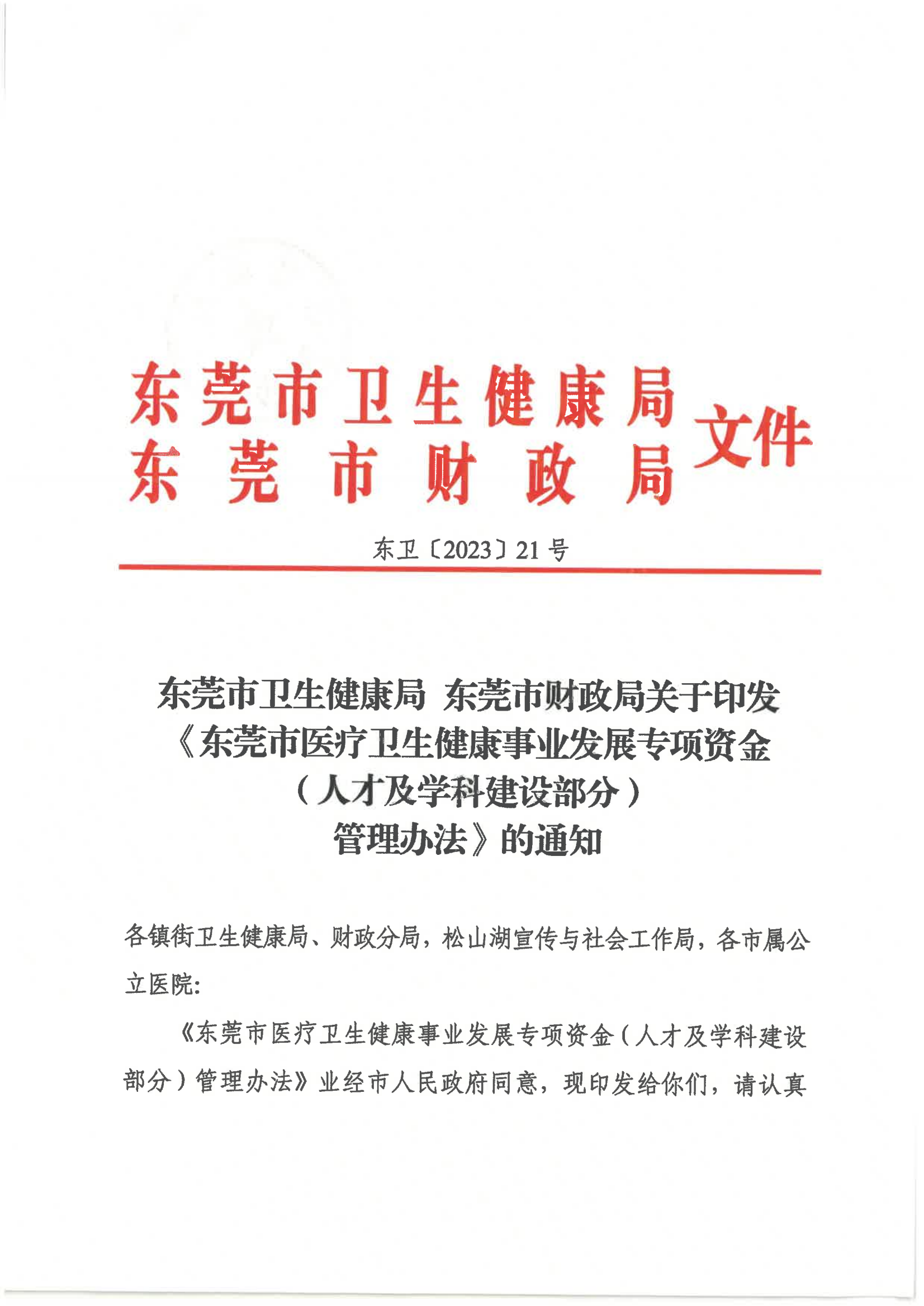 来源:东莞市卫生健康局近日,广东省东莞市卫生健康局、市财政局联合印发《东莞市医疗卫生健康事业发展专项资金(人才及学科建设部分)管理办法》。《办法》明确,2023年4月—2026月3月,东莞将每年安排市财政专项资金支出预算约5468.4万元,支持全市各类医疗机构人才队伍培养及引进、重点专科建设补助等支出。全文如下: