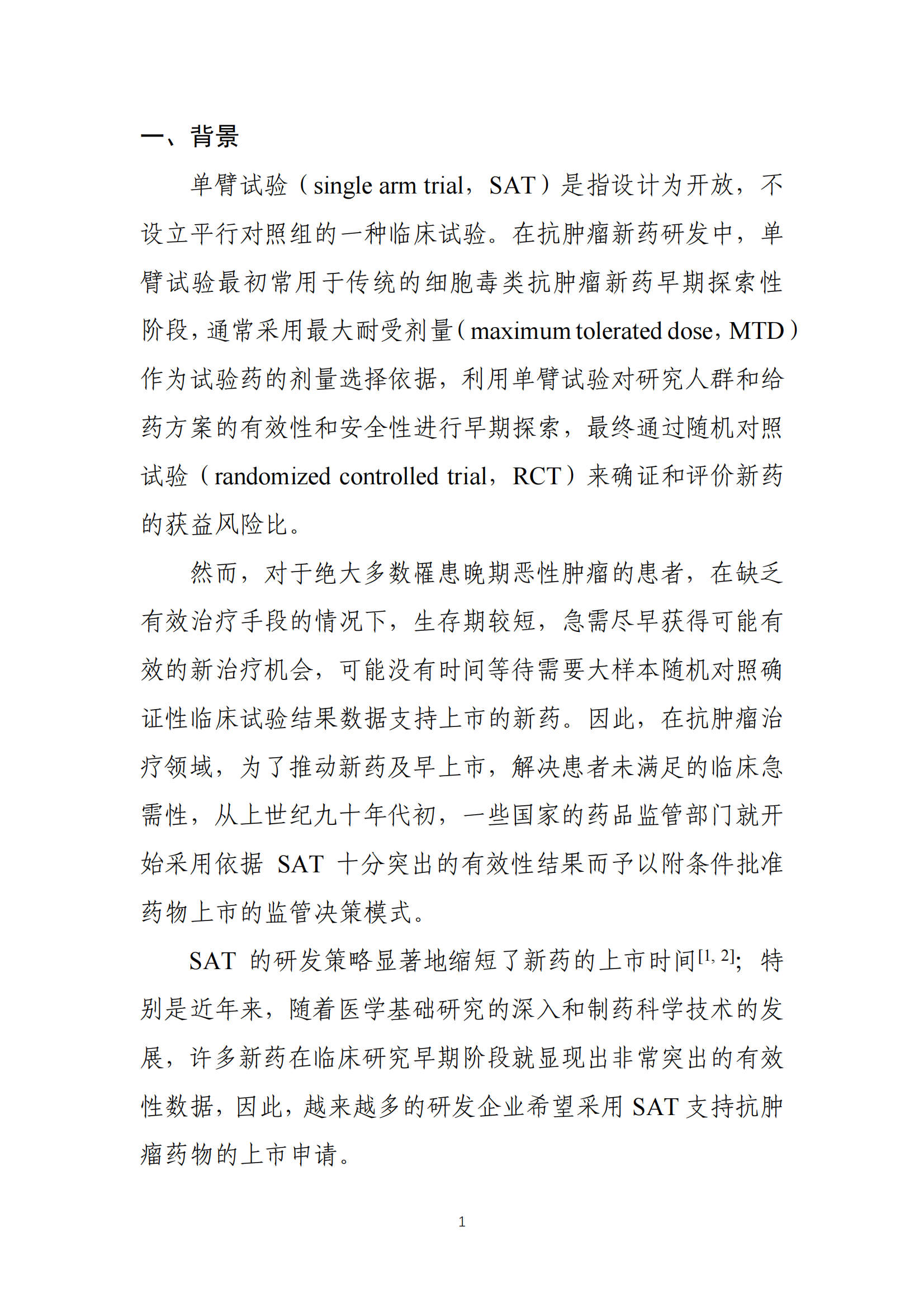 为阐明当前对单臂临床试验用于支持抗肿瘤药上市申请的适用性的科学认识,指导企业在完成早期研究后,更好地评估是否适合开展单臂临床试验作为关键临床研究,以支持后续的上市申请,在国家药品监督管理局的部署下,药审中心组织制定了《单臂临床试验用于支持抗肿瘤药上市申请的适用性技术指导原则》(见附件)。根据《国家药监局综合司关于印发药品技术指导原则发布程序的通知》(药监综药管〔2020〕9号)要求,经国家药品监督管理局审查同意,现予发布,自发布之日起施行。