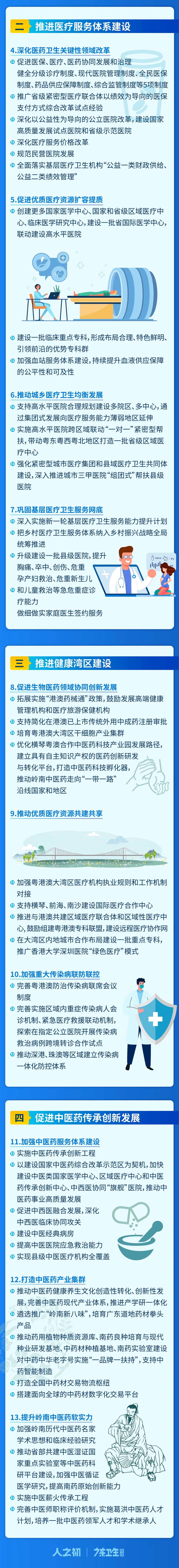 (十一)推动优质医疗资源共建共享。加强粤港澳大湾区医疗机构执业规则和工作机制对接,实现更高程度的信息互通和资源共享。支持横琴、前海、南沙建设国际医疗合作中心。推进与港澳共建区域医疗联合体和区域性医疗中心,鼓励组建粤港澳专科联盟,建设远程医疗协作网,推动在人才培育、临床研究、诊疗服务等方面深度合作。在大湾区内地城市合作布局建设一批重点专科,推广香港大学深圳医院“绿色医疗”模式。