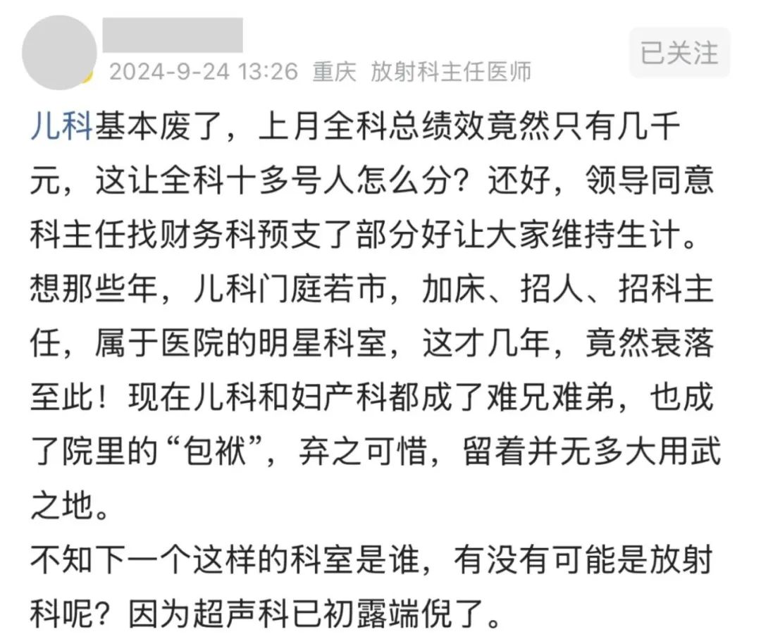 更有重庆某医院放射科主任在网上发文称:我们医院儿科基本废了,上月全科总绩效只有几千元,这让全科十多号人怎么分?还好,领导同意科主任找财务科预支了部分工资,好让大家维持生计。
