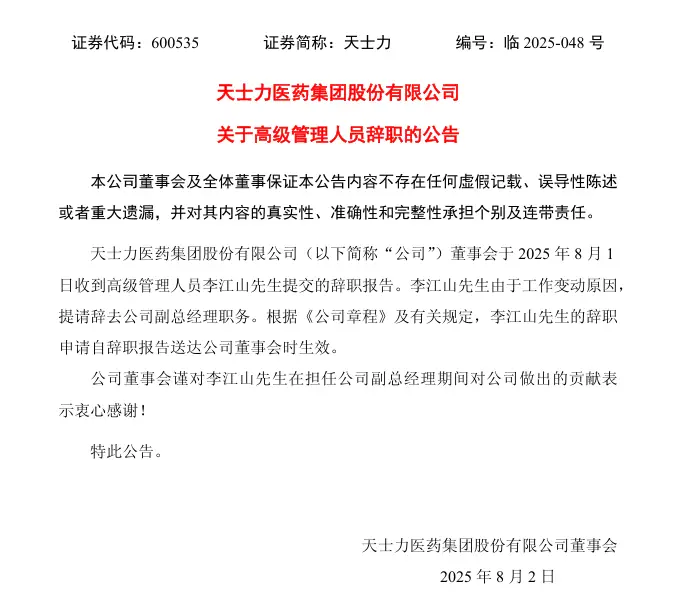 8月1日晚间,天士发布公告称,公司董事会于2025年8月1日收到高级管理人员李江山先生提交的辞职报告。李江山先生由于工作变动原因,提请辞去公司副总经理职务。根据Wind数据显示,李江山2024年度薪酬达121.98万元,在同期五名监事中位居薪酬榜首。