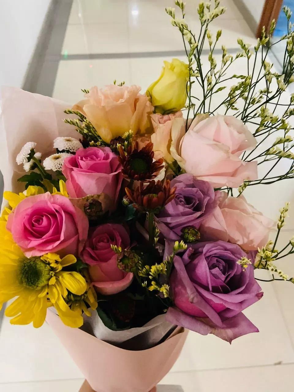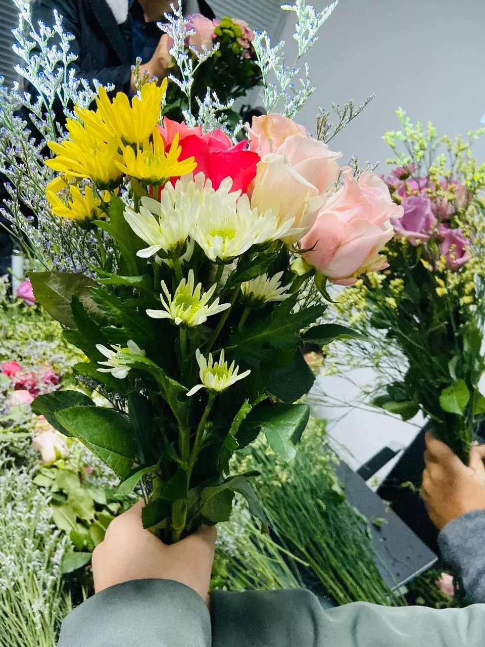 材料准备就绪,满天星、菊花、粉玫瑰、白玫瑰...就在等“花艺师”们来释放它们的美。