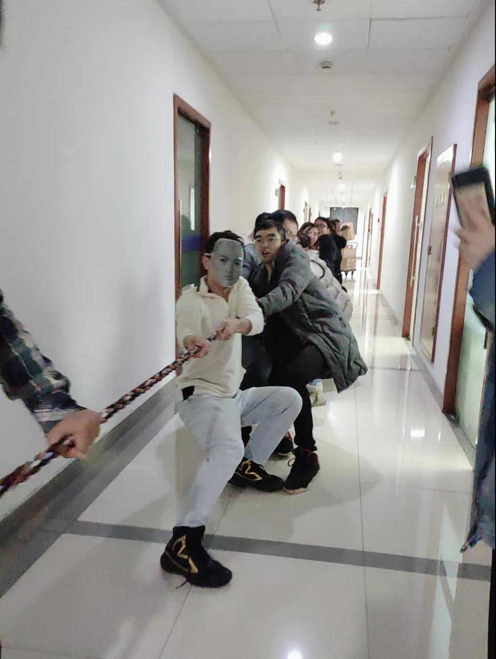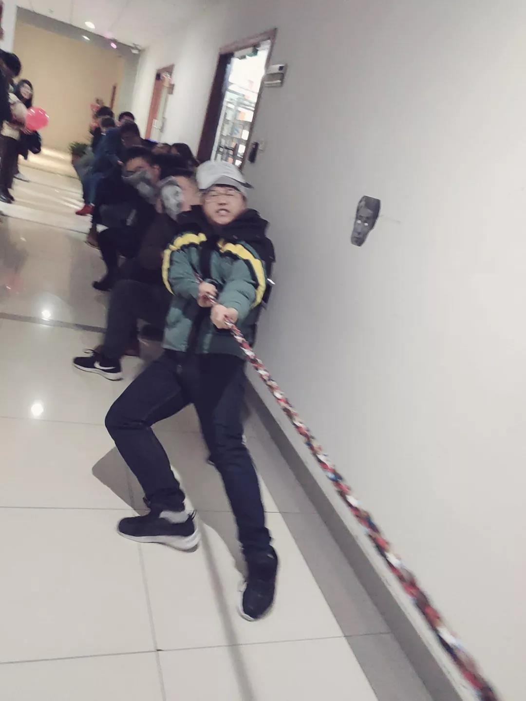一声哨响,大家拼命地拉了起来,嘿咻嘿咻,响彻楼道,你们猜是哪队赢了?