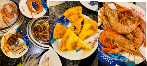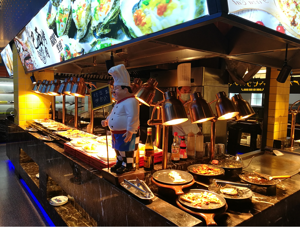 环境优美的餐厅,淡蓝色的格调让人仿佛置身海洋,各种海鲜、烤肉、小吃、甜点罗列其中,任君挑选。